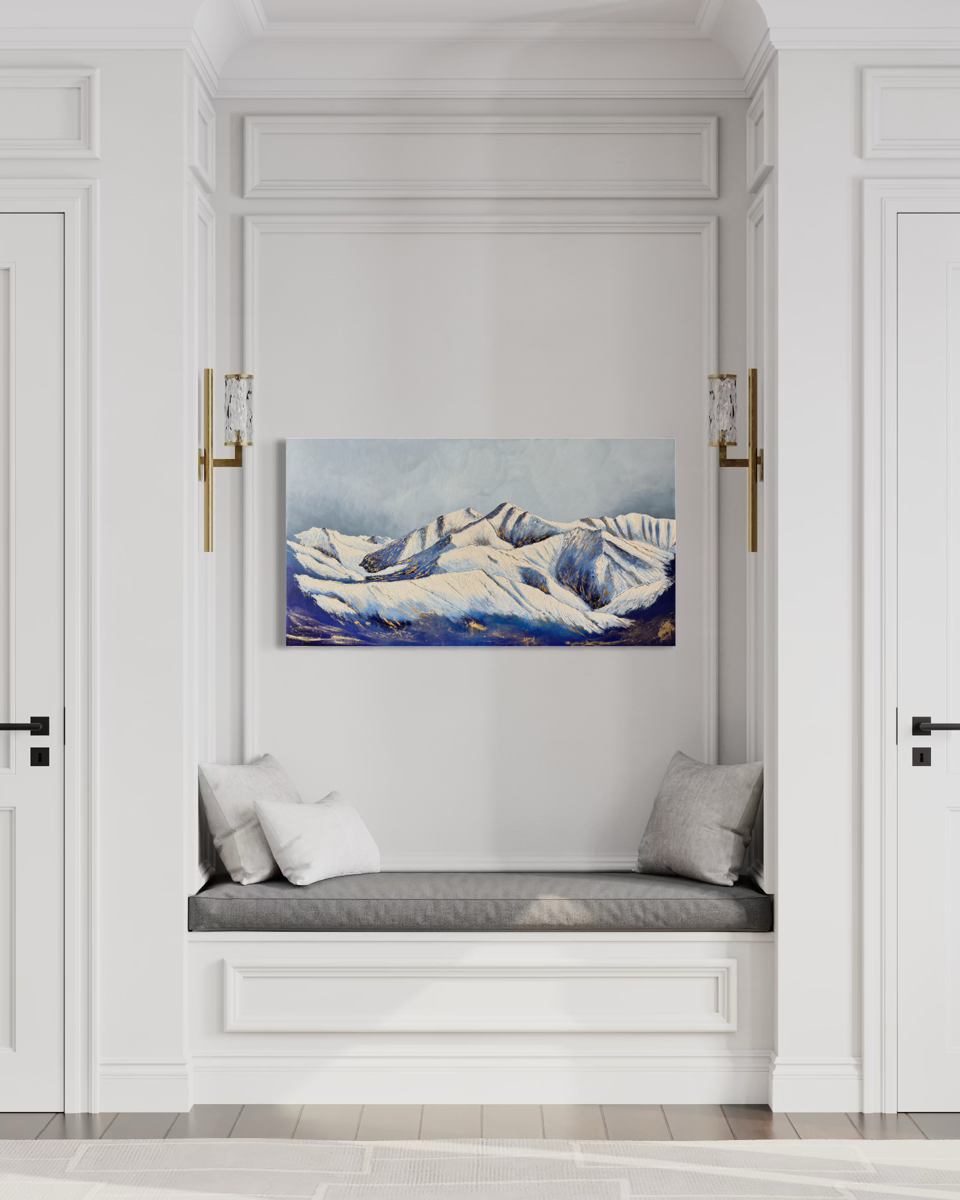 The indigo blues and layered textures in this work echo that experience — the weight of stone, the quiet of sky, the slow light returning after shadow.