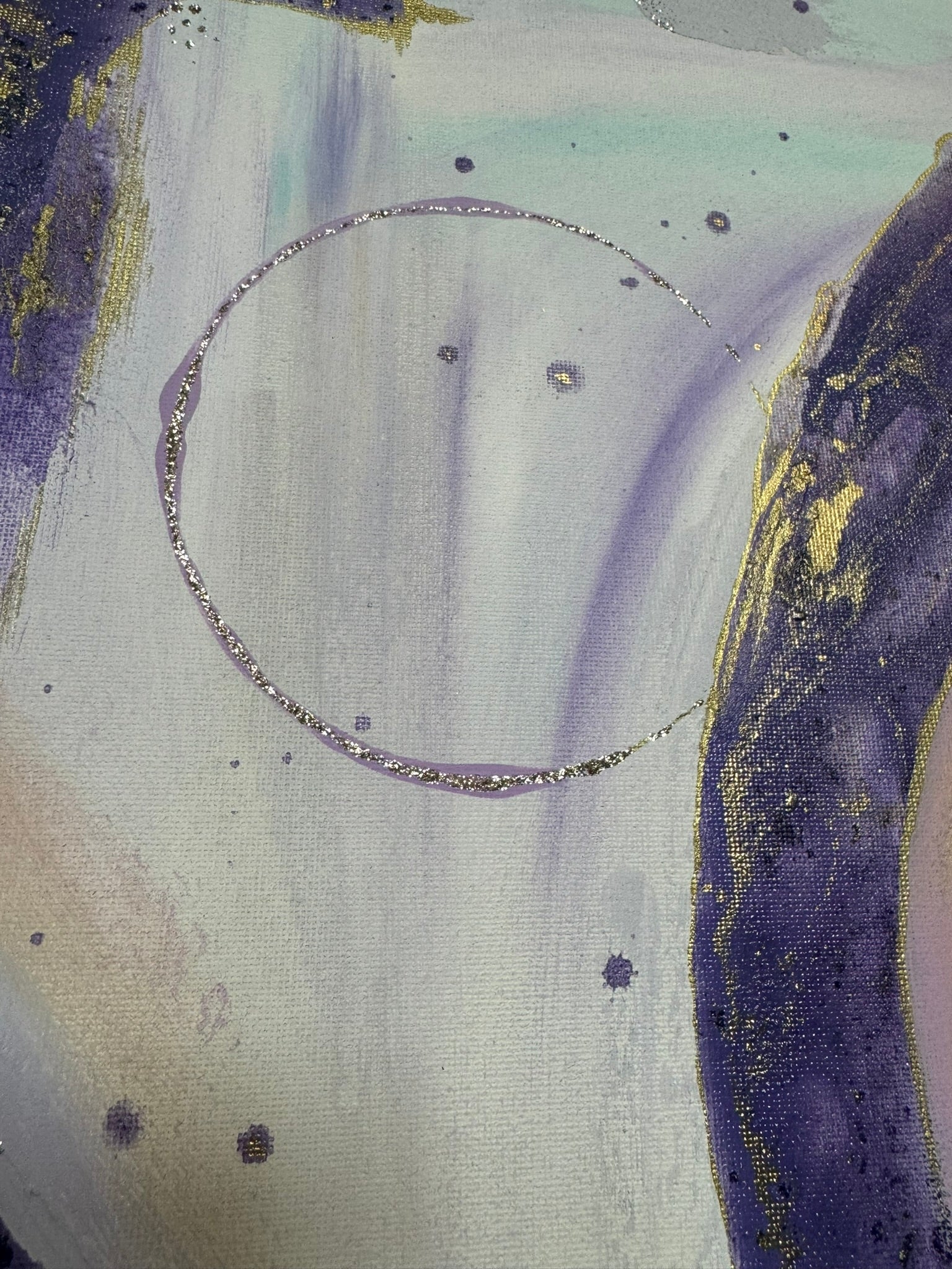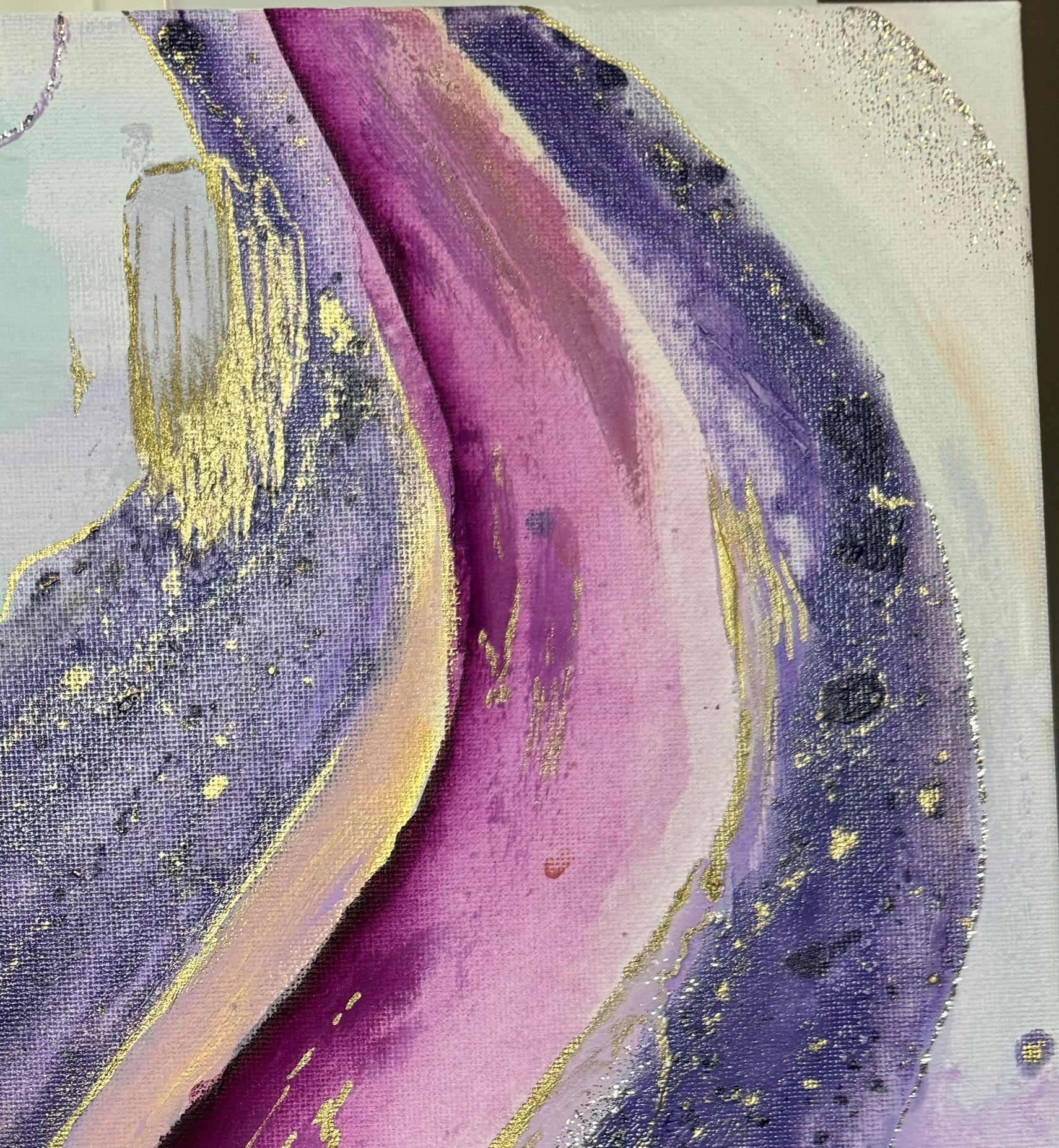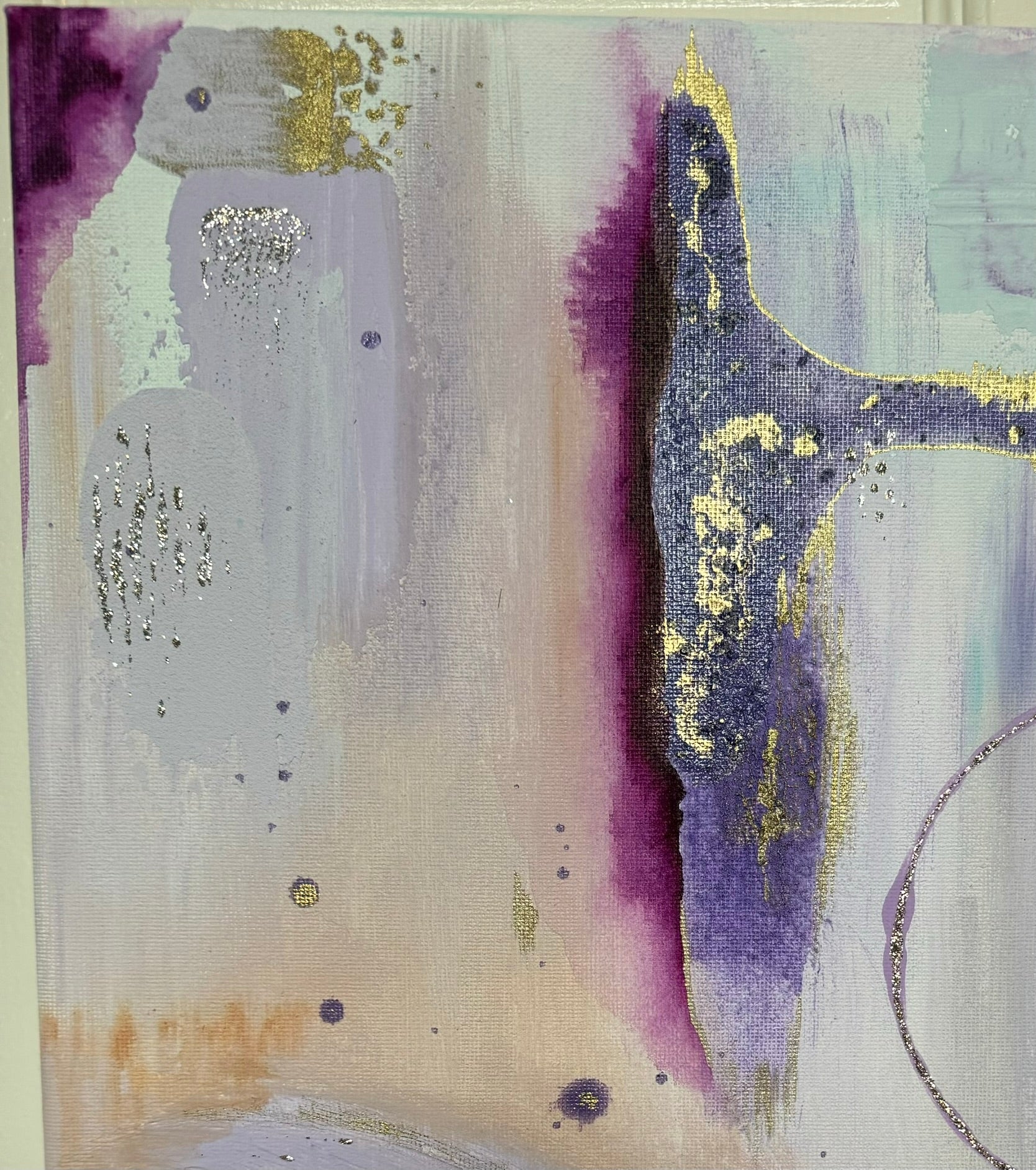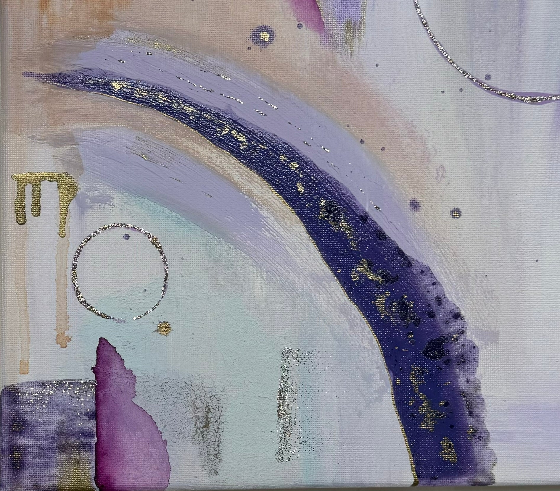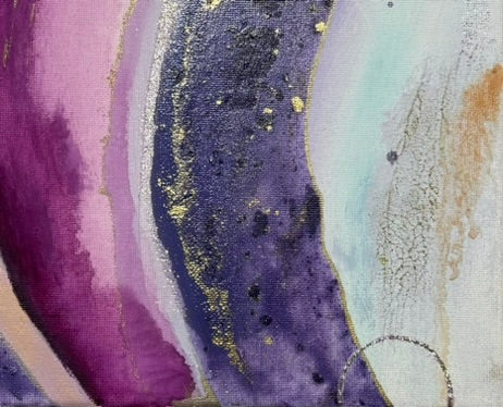 The third of the new series “Ignition”, “Seraphina” has some major spirit. She is made with more different textures and values than anything other so far in this series. Always a favorable color palette with rich purples in contrast with some quieter areas of lilac and light blue, she takes you through a journey of discover to each of her magnificent corners. Of course, as the light reflects off of the specs of gold, your eyes will dance along to her tunes. A sure win in an entry way, a small hallway, or right in front of your bathtub. The perfect way to become mesmerized and reduce your thoughts to dust as you wind down for the week! Come relax with “Seraphina”💕