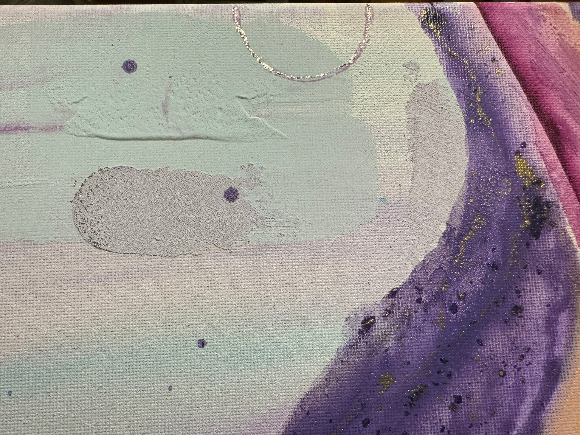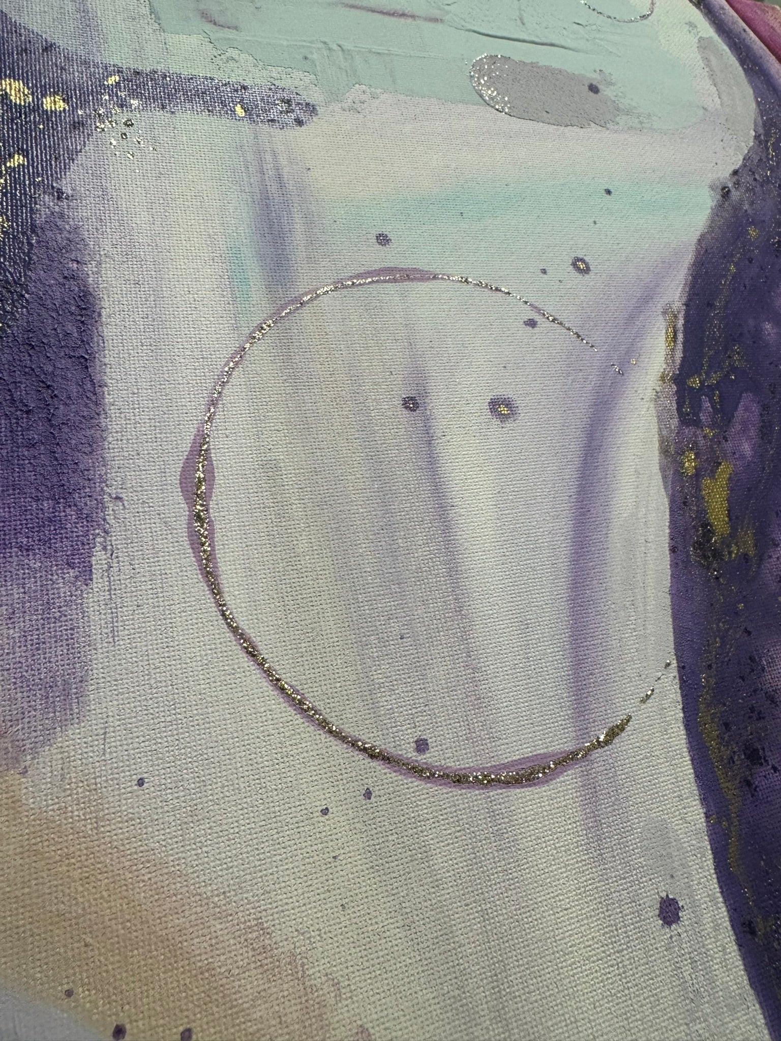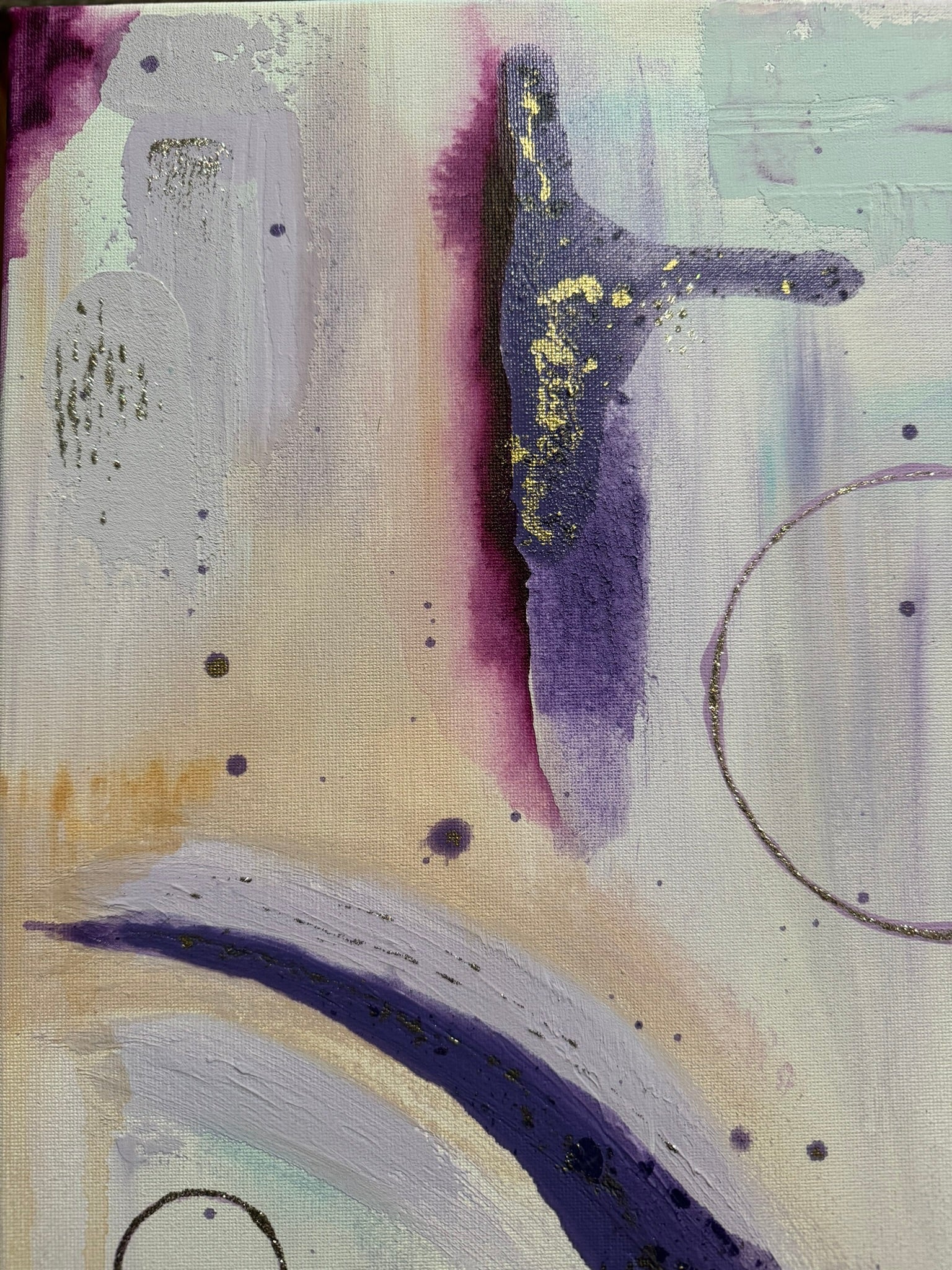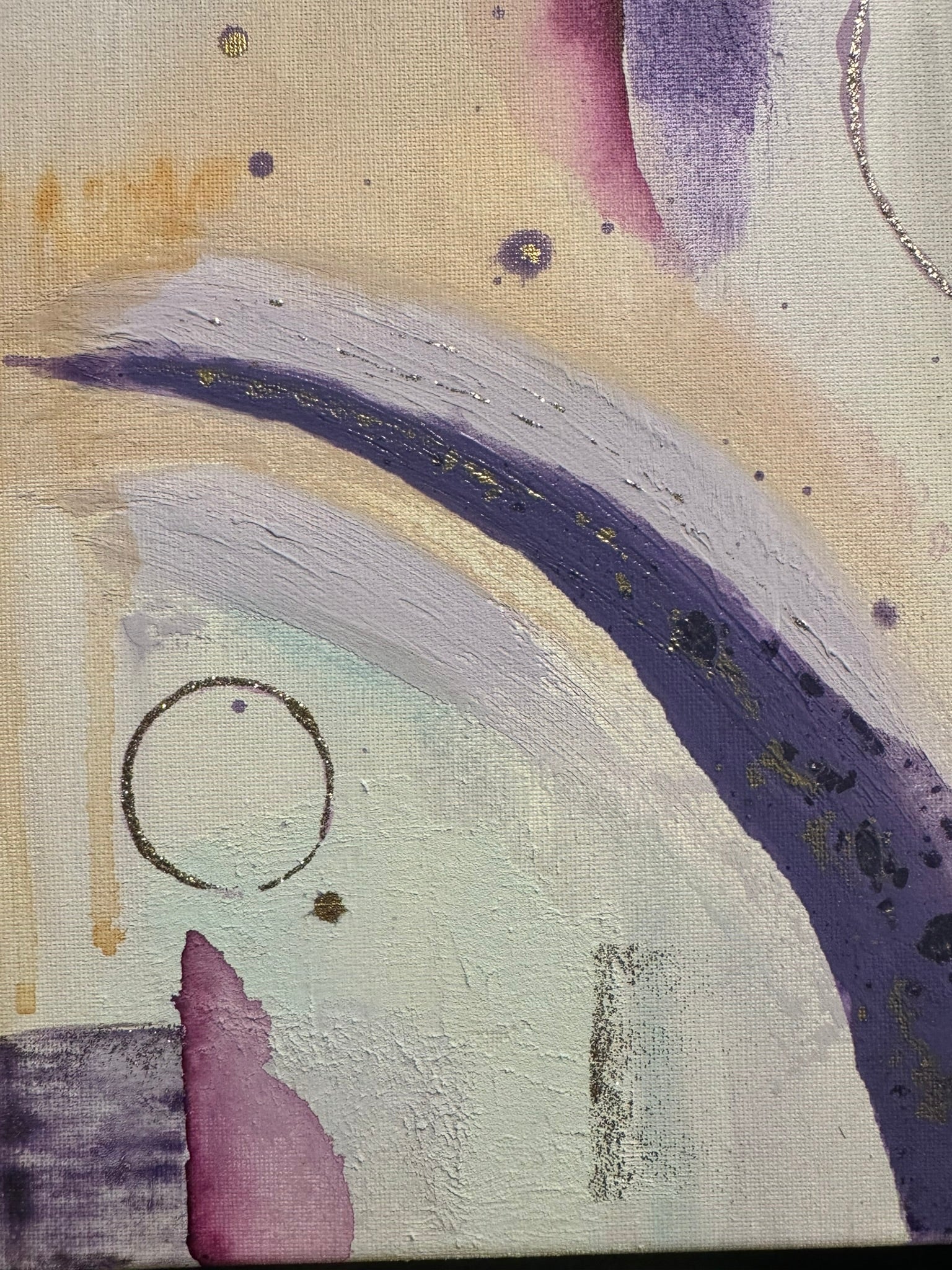 The third of the new series “Ignition”, “Seraphina” has some major spirit. She is made with more different textures and values than anything other so far in this series. Always a favorable color palette with rich purples in contrast with some quieter areas of lilac and light blue, she takes you through a journey of discover to each of her magnificent corners. Of course, as the light reflects off of the specs of gold, your eyes will dance along to her tunes. A sure win in an entry way, a small hallway, or right in front of your bathtub. The perfect way to become mesmerized and reduce your thoughts to dust as you wind down for the week! Come relax with “Seraphina”💕